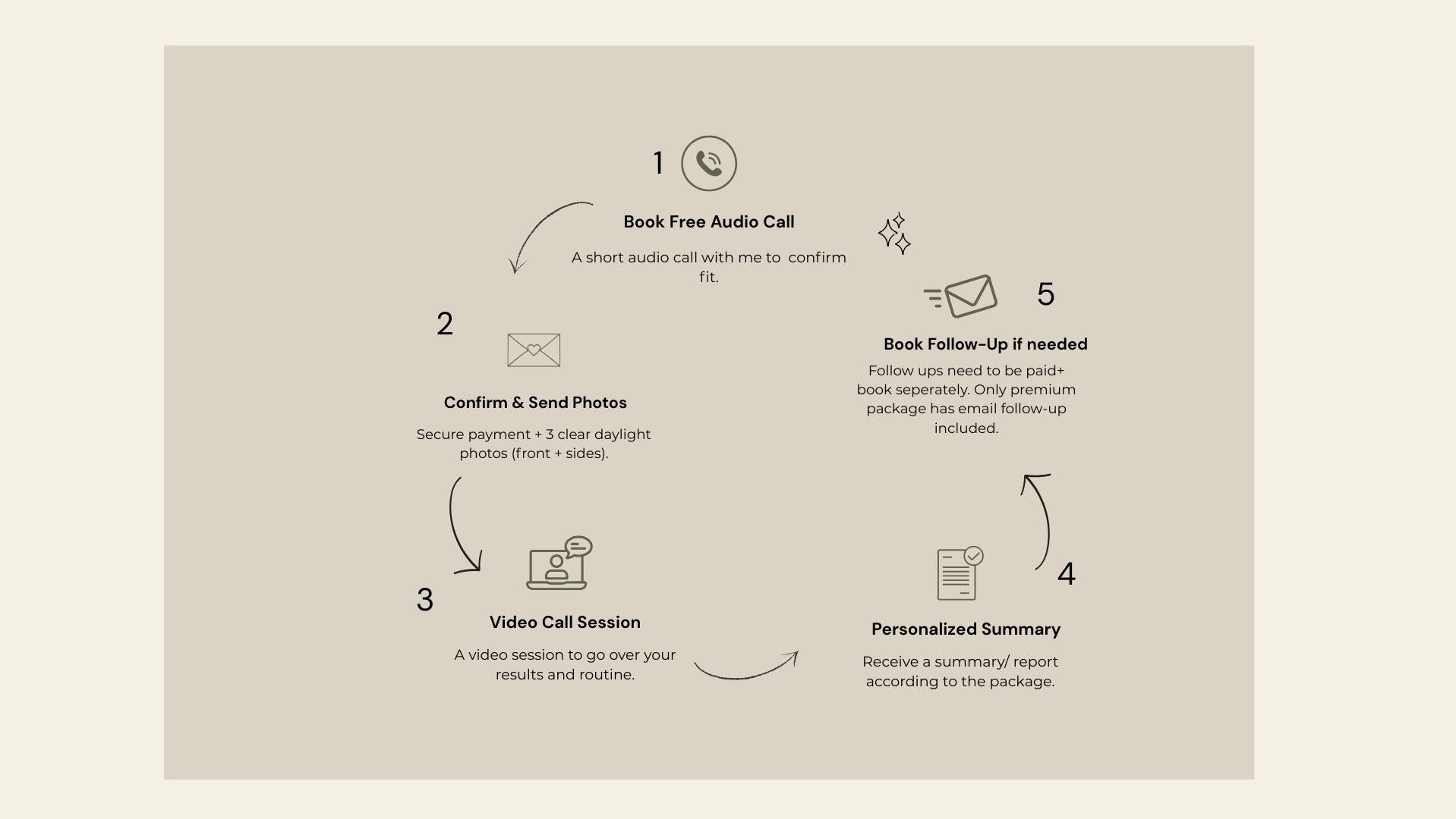 1. Book a Free Audio CallA short call to discuss your skin concerns and confirm if the service is the right fit. You’ll share your goals, and I’ll explain how the process works.2. Confirm & Send PhotosOnce we decide to move forward, I’ll send you the necessary paperwork for the session, this includes a short client intake form, a skin history questionnaire, and a professional disclaimer outlining service boundaries and consent.You’ll complete your payment, fill out the forms, schedule a slot and send three clear daylight photos (front and sides) for analysis.3. Live Video Session (40/60 mins)After I receive your paperwork, we meet in a video call (40–60 minutes depending on the package) to review your skin concerns, triggers, and goals with a gut–skin and Ayurvedic lens..4. Personalized AnalysisUpon finishing the live call, you will recieve your written summary or detailed report based on the package you choose, outlining your routine, guidance, and next steps. within 7 business days.5. Follow-Up (If Needed)Follow-up sessions are booked separately unless included in your package (premium package has one email follow up included).